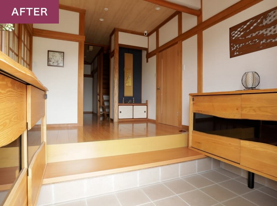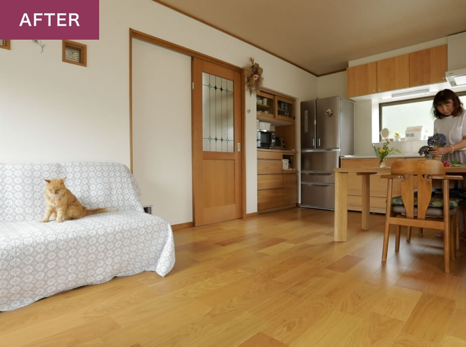 キッチンの空間が少し広くなったのがとてもよかったと思います。使い勝手はとてもいいです。猫ちゃんドアもつけてもらったし。玄関の壁紙全部を替えたので、一体感があってパッと明るいのが嬉しいです。帰ったときに「ただいま」という感じがします。私が「こういう風にしてほしいな」という想いをよく聞いてくださいました。