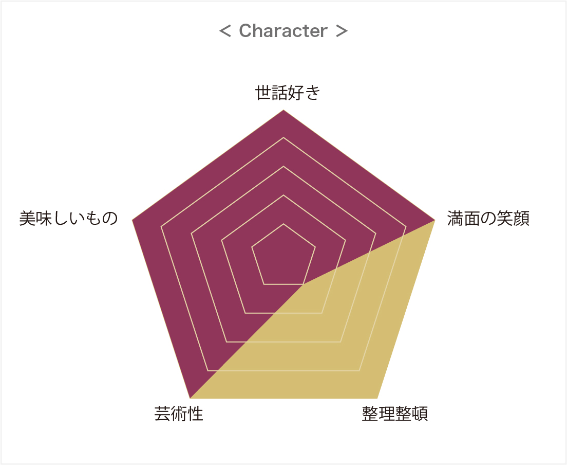 美味しいものに目が無く、いつも何かを食べている人。いつもにこにこ笑顔でオフィスの雰囲気も明るくしてくれる存在です。世話好きで、企画好きで、絵心もあるクリエイティブな一面も彼女の特徴ですね。お客様にもよく褒められる才能の持ち主です。ただし、掃除や整理整頓は苦手。