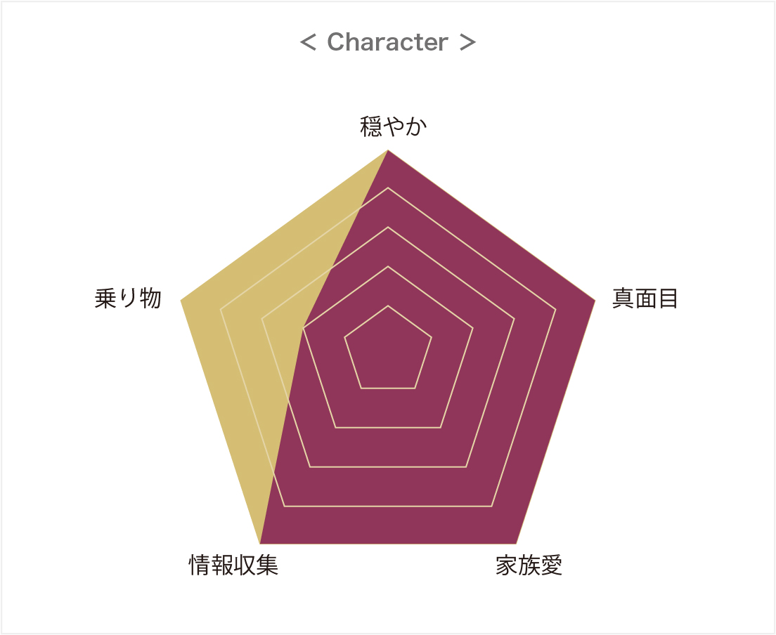 コツコツ真面目に仕事ができる、穏やかな人。お客様への丁寧で柔軟な対応もすばらしく、家族のことも大好きでいつも楽しそうにお話しをしてくれます。ニュースや近隣情報など、なんでも調べてしまう情報収集能力のおかげで社内では「もの知り博士」として重宝しています。乗り物酔いしてしまうので、バスや船は苦手らしい。
